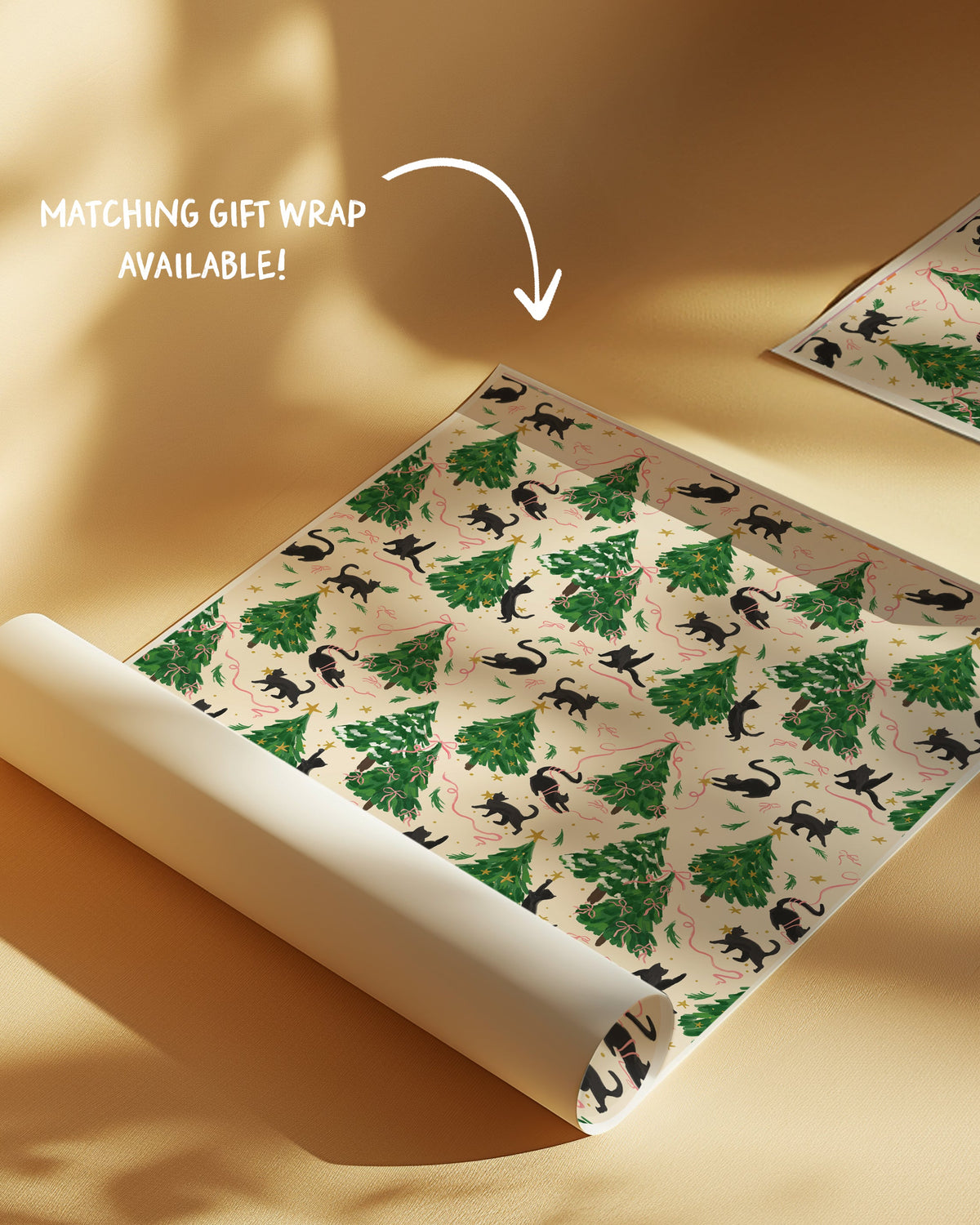 A Christmas card featuring playful black cats and festive tree illustrations, finished with metallic gold printing on both the cover and the inside message. Printed in the UK on high-quality cardstock.